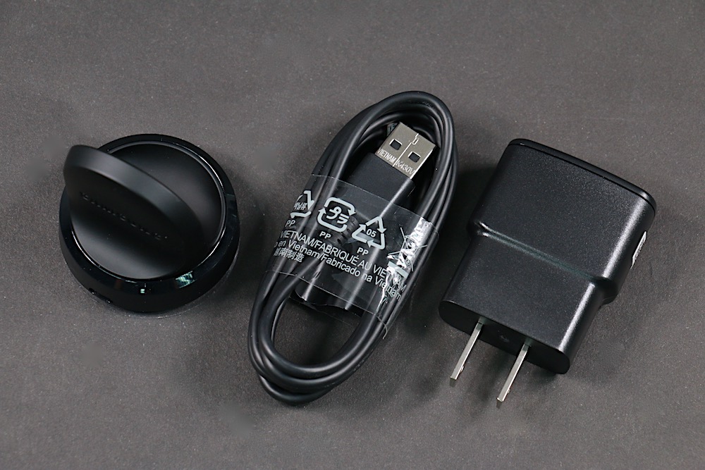 盒裝內除了 Galaxy Watch 46mm 本體之外,還另有附贈一個充電器、一條 USB 充電線,以及一個磁吸式充電底座,只要組裝完成並將手錶放置在充電座上,就可以開始進行充電。另外,充電的過程中,Galaxy Watch 46mm 會貼心的將螢幕畫面轉正,方便檢視目前時間或接收任何訊息。