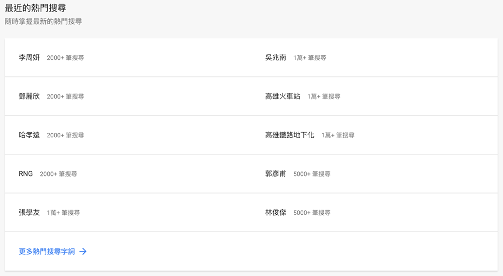 另外也可以藉由 Google Trends 來觀察熱門話題和搜尋關鍵字,其實我們在寫文的過程也可以適度加入一些關鍵字,這也是增加網站能見度和流量的好方式唷!