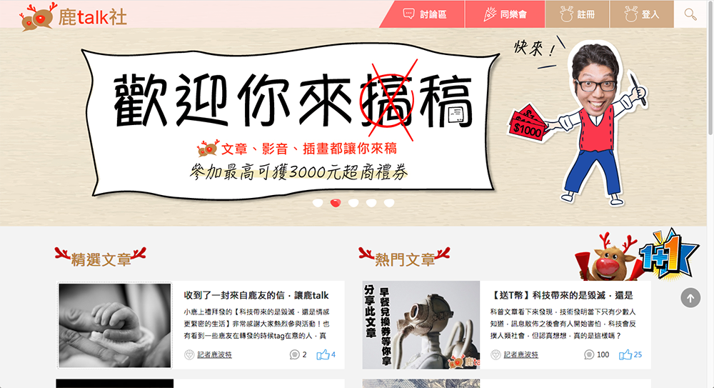 審核通過文章就可以顯示在討論區,而且還送 1000 元超商禮券。每周加碼超級「鹿」出獎(他們真的很愛諧音梗XD),只要文章榮登首頁精選文章一周,就再送你 2000 元超商禮券。簡單來說就是你的單篇投稿最高有機會獲得 3000 元禮券啦!