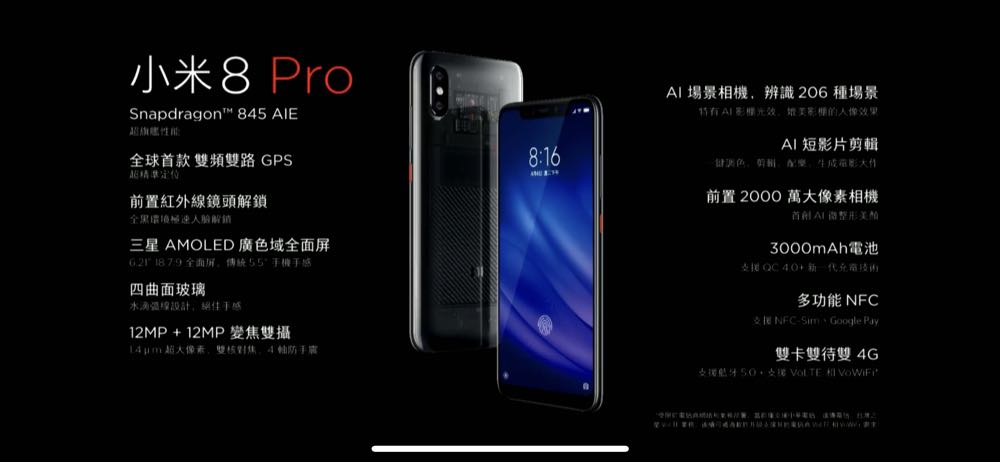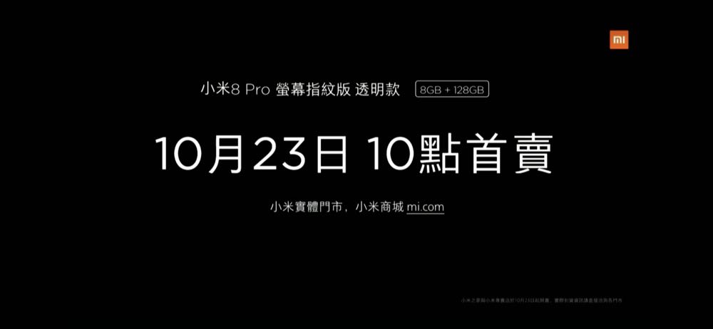 小米台灣今(22)日宣布推出小米8 Pro 螢幕指紋版,為小米 8 周年旗艦代表作全新升級,以頂級四曲面透明機身工藝,支援全球首款壓感螢幕指紋辨識和雙頻 GPS 功能,搭載 Snapdragon 845 與 AI 超感光雙攝相機,支援紅外線人臉解鎖,售價 15,999 元(8GB + 128GB),10 月 23 日早上 10:00 在小米商城 mi.com 與小米實體門市開賣。