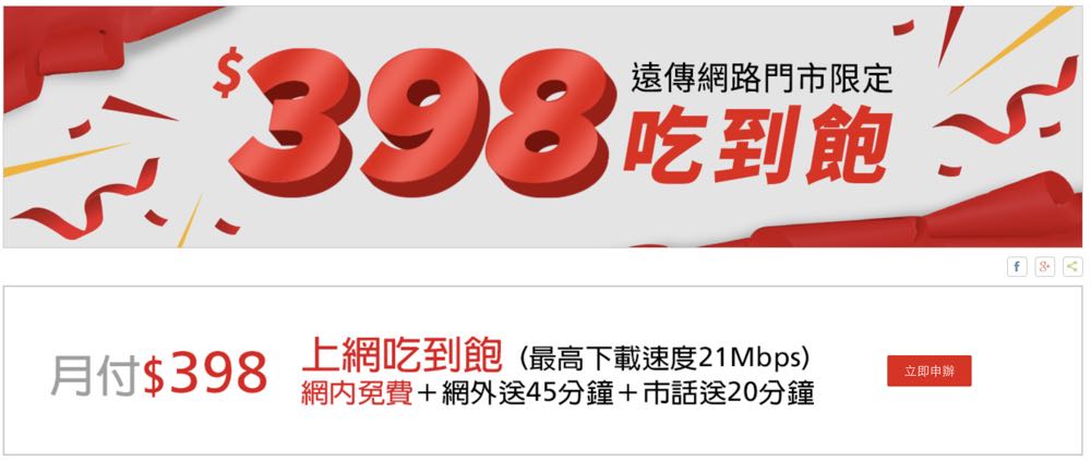 優惠內容:$398 / 24 個月,21M 上網吃到飽、網內免費,網外每月贈 45 分鐘,市話每月贈 20 分鐘