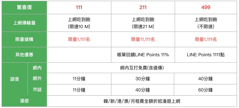。$499 /12 個月、限速 21 M、帳單回饋 LINE Points 1111點、網內互打免費、網外 40 分鐘、市話 60 分鐘。