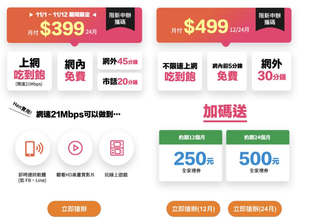 $499 / 12 個月或 24 個月,21M 上網吃到飽、網內前 5 分鐘免費、網外 30 分鐘,加碼送 250 元(12 個月)、500 元(24 個月)全家禮券。