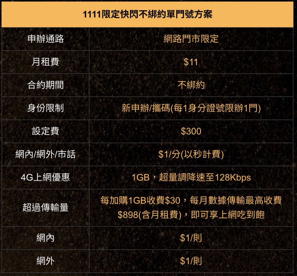 優惠內容:單門號月繳 399 元,享每月 1GB 不限速行動上網、網內每通前 5 分鐘免費、每月送市話 111 分鐘及網外 30 分鐘,合約期間再加贈 1,111GB。