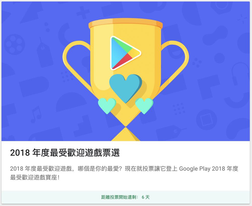2018 年即將進入尾聲,Google 在每年 12 月會公布「Google Play 年度最佳榜單」,分享一整年在 Google Play上最佳的應用程式、遊戲、電影和書籍等內容。今年,令人期待的台灣 Google Play 2018 年度最佳榜單,首次新增「2018 年度最受歡迎遊戲」與「2018 年度最受歡迎應用程式」兩個獎項,並且讓大家能到 Google Play 上投票選出最喜愛的應用程式和遊戲,一起參與 Google Play 的年末盛事!