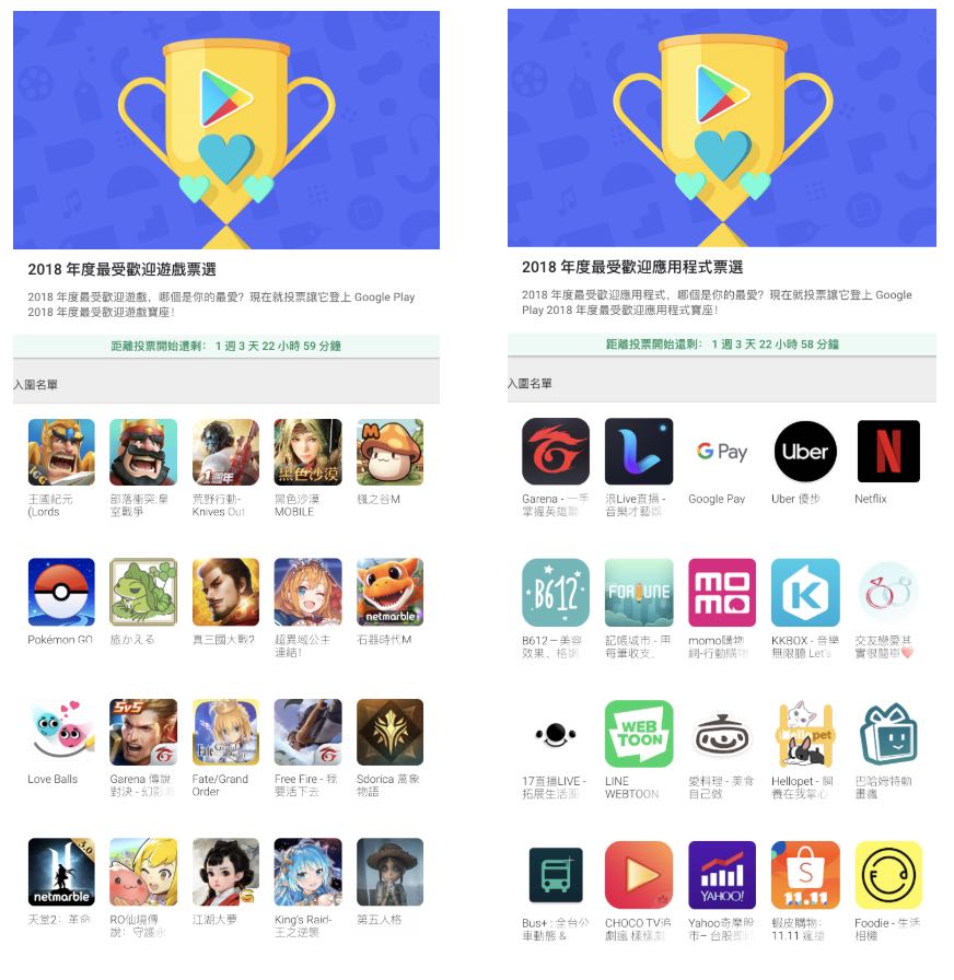 Google Play 日前公布 2018 年度最受歡迎遊戲和 2018 年度最受歡迎應用程式各 20 款入圍名單,並預告票選活動將在 2018 年 11 月 12 日至 2018 年 11 月 26 日舉行,得獎名單則是會在 2018 年 12 月 3 日公布。在這段活動期間,只要登入 Google Play 並前往票選活動頁面,就能獲得兩個獎項各一票的票選資格。趕快邀請親朋好友們到Google Play 投下神聖的一票,讓喜愛的遊戲及應用程式登上 Google Play 2018 年度最受歡迎榜單的寶座吧!