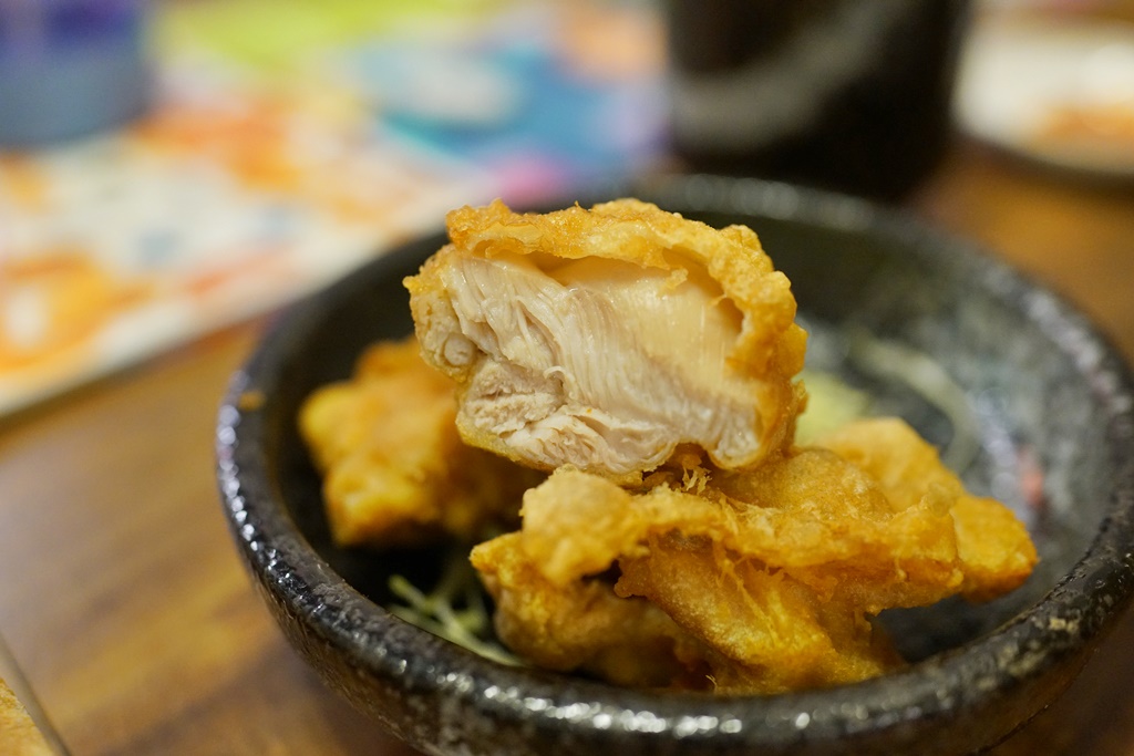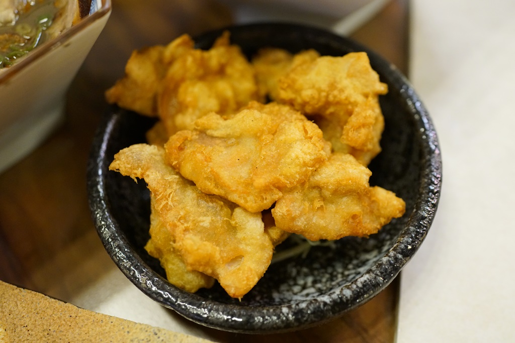 點雙料辛担麵附的唐揚雞是三塊,吃不夠也可單點,當然單點的份量會比較多,而且看起來比較大塊,他們家的唐揚雞外酥內嫩又多汁,真的蠻好吃的!