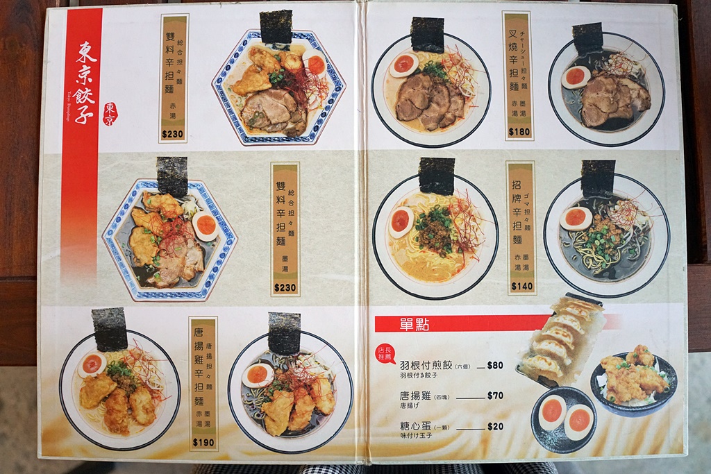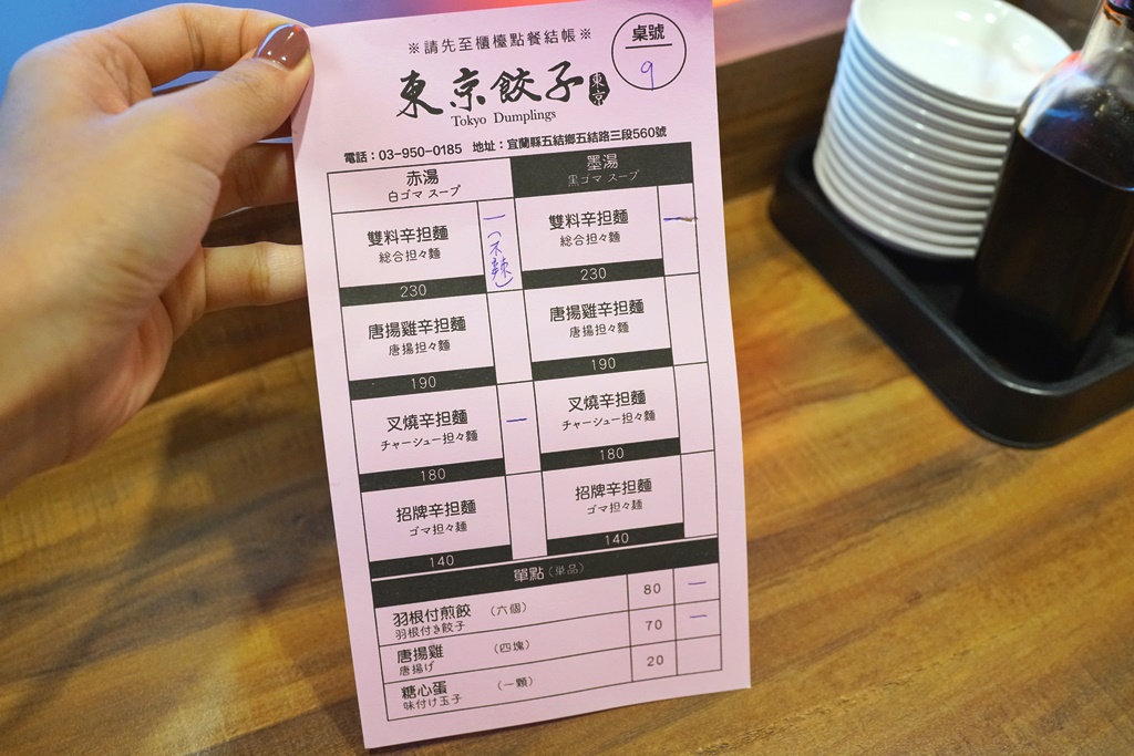 這趟宜蘭輕旅行安排了「東京餃子」,讓人有不虛此行的感覺,台日混搭的辛担麵,濃厚的芝麻香氣搭配特製肉燥的雙重享受,還有充滿日本味的羽根付煎餃、外酥內嫩富有肉汁的唐揚雞,份量實在、價格合理,吃完非常有飽足感,覺得相當超值呢!