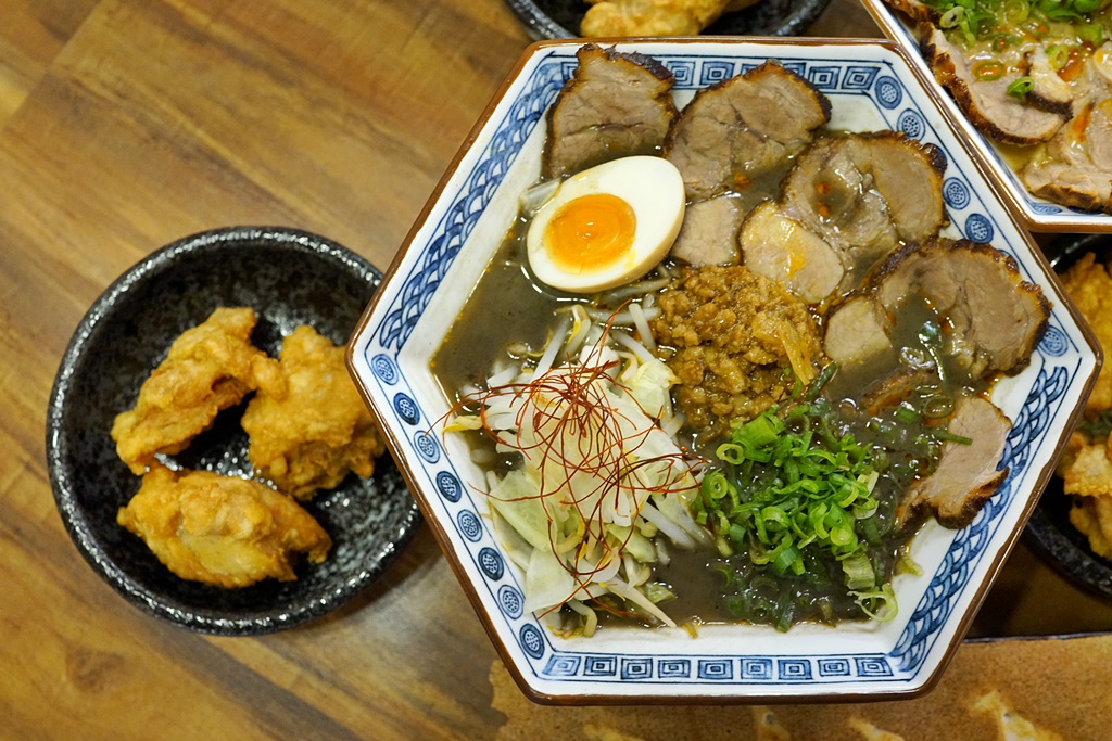 雙料指的是叉燒與唐揚雞,共有五片叉燒肉+三塊唐揚雞,麵的份量也不少,對一般食量的人來說,這碗超有飽足感,先說肉的部分,叉燒的香氣十足,口感薄嫩帶Q彈,炸好的唐揚雞是另附在旁邊,吃起來外酥內嫩、保有肉汁,墨湯是指黑芝麻湯底,湯頭喝起來有著濃厚黑芝麻香氣,要吃麵之前,建議將秘傳的胡麻湯底與特製肉燥攪拌一下,拌上肉燥的味道後,瞬間融入了擔擔麵的風味,相當的特別!