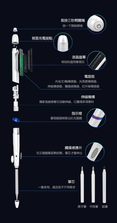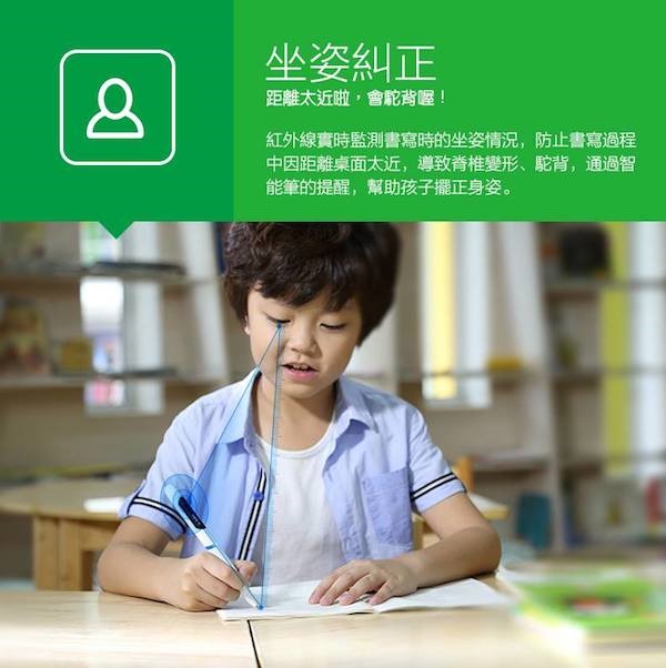 至於書寫姿勢不良除了有剛才提到的的「握姿糾正」,還有透過紅外線距離感測裝置來調整孩童的「坐姿糾正」功能。一樣是以語音提醒,以及筆芯自動伸縮系統,只要身體距離智能筆過近,臉部距離書本過近都會進而發揮功能。