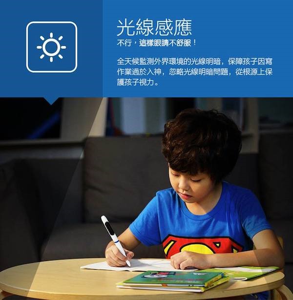 不只是握筆姿勢,文章前頭提到的「光線條件不佳」與「書寫姿勢不良」更是智能筆得以發揮的地方!Benson表示由於孩子們放學回家大多是下午四點至六點,太陽逐漸下山,光線逐漸微弱的時段,孩子們容易在專心做功課的狀態下,忽略了點開電燈,補充光源的重要性。而智能筆能依賴裡頭的晶片感測光線不足,進而主動發出提醒,並將筆尖縮入,待學童開燈補充光源後才能繼續書寫使用。