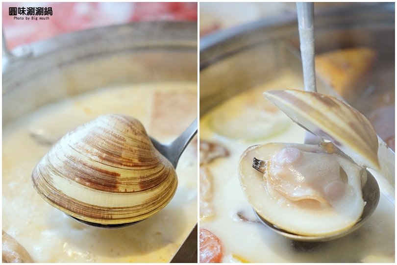 ▼牛奶貝,一顆就佔滿整根湯匙啦~因為個頭較大,煮的時候也較一般蛤蜊來的久一些!吃起來肉質較為香Q滑嫩,同樣帶有濃濃的鮮美海味,一口咬下超過癮的啦!