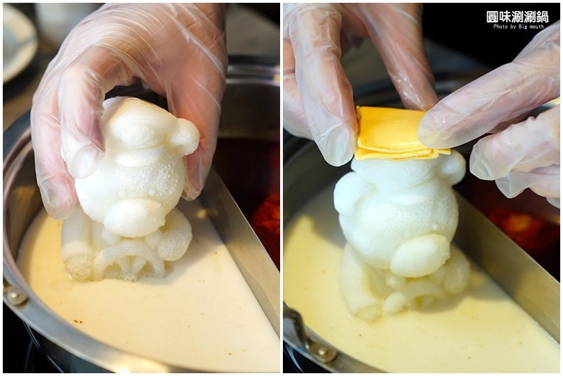 ▼沒多久就要準備下鍋泡湯啦(誤)~服務人員會貼心附上手套讓大家可以將高湯熊放入湯底,再將起司片對折再對折就可以放在熊熊頭上,看起來就很像是放毛巾在頭上泡湯的模樣囉!