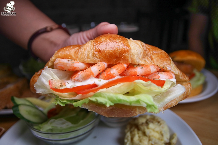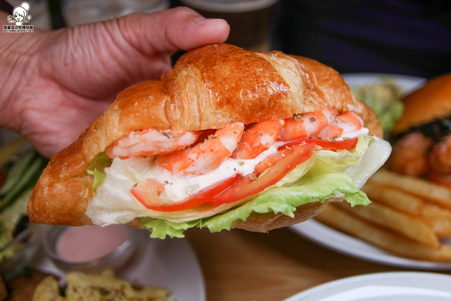 超人推薦的蝦蝦塔可頌套餐,很多蝦蝦堆疊的可頌堡