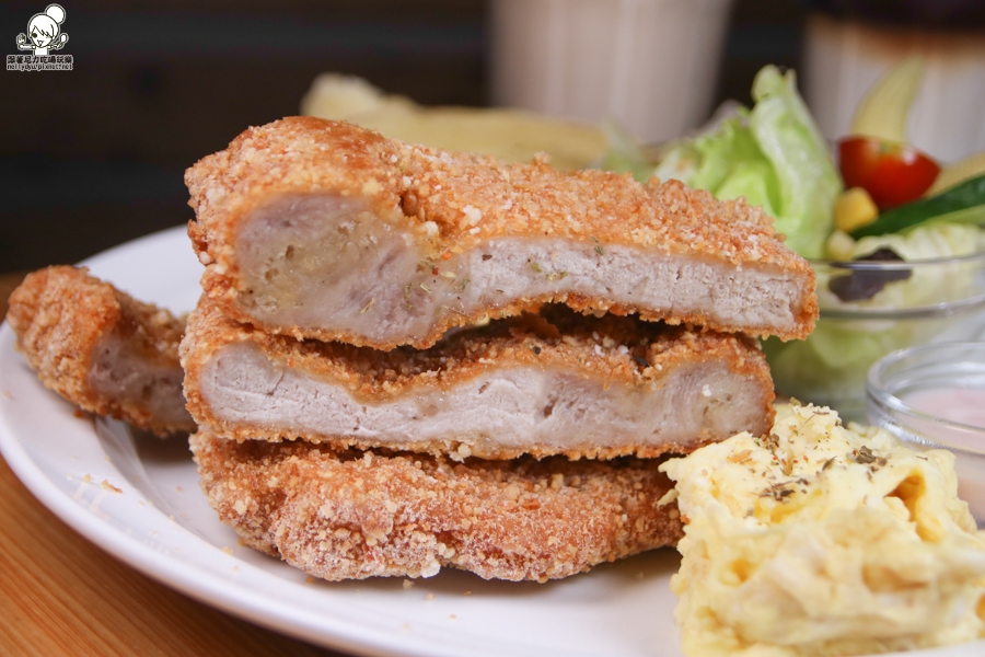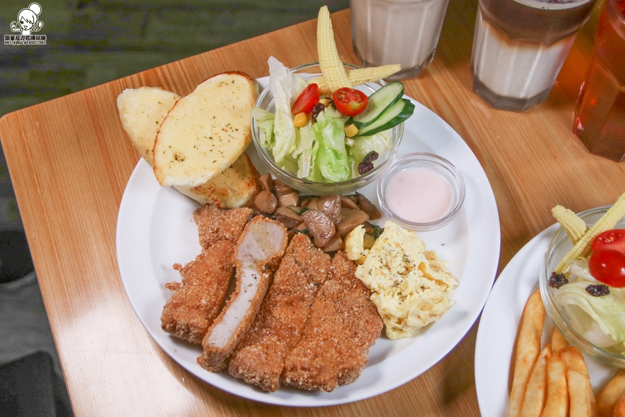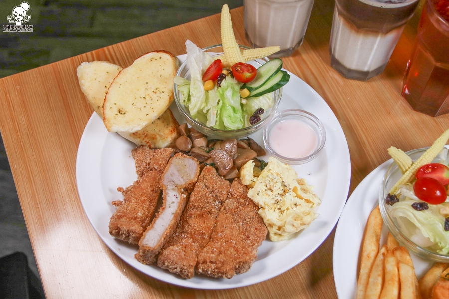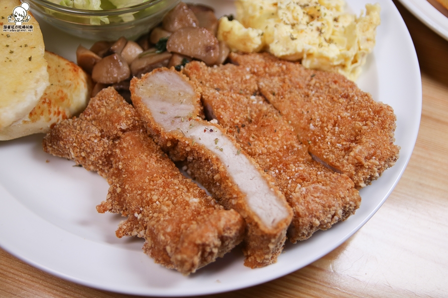 油炸處理很細膩唷,搭配季節配菜、沙拉、蒜香麵包、炒蛋