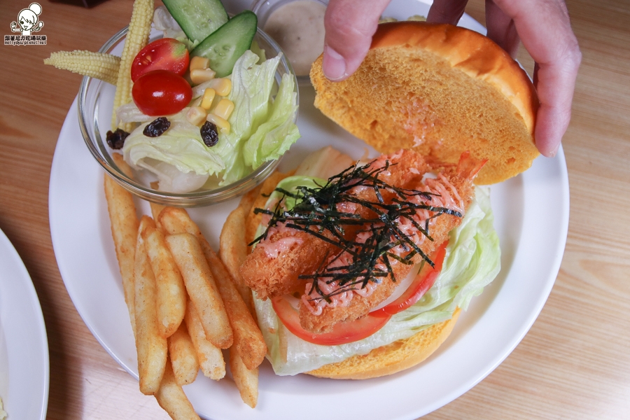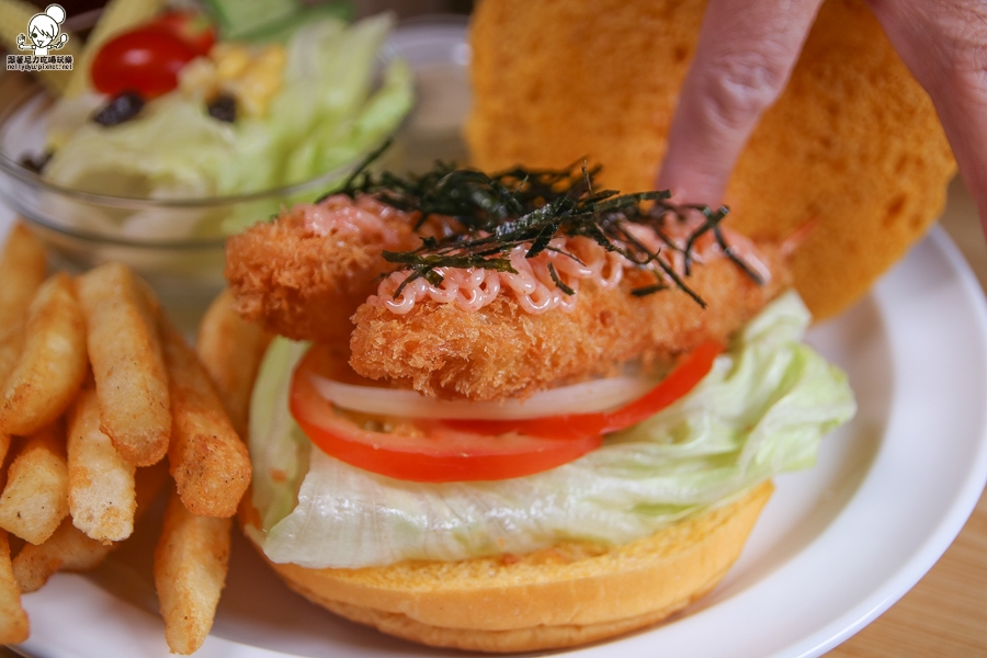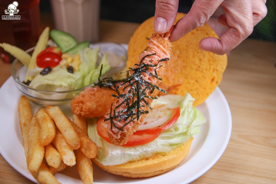 飽滿的特製漢堡,搭配酥脆香氣的炸蝦,淋上明太子醬提味