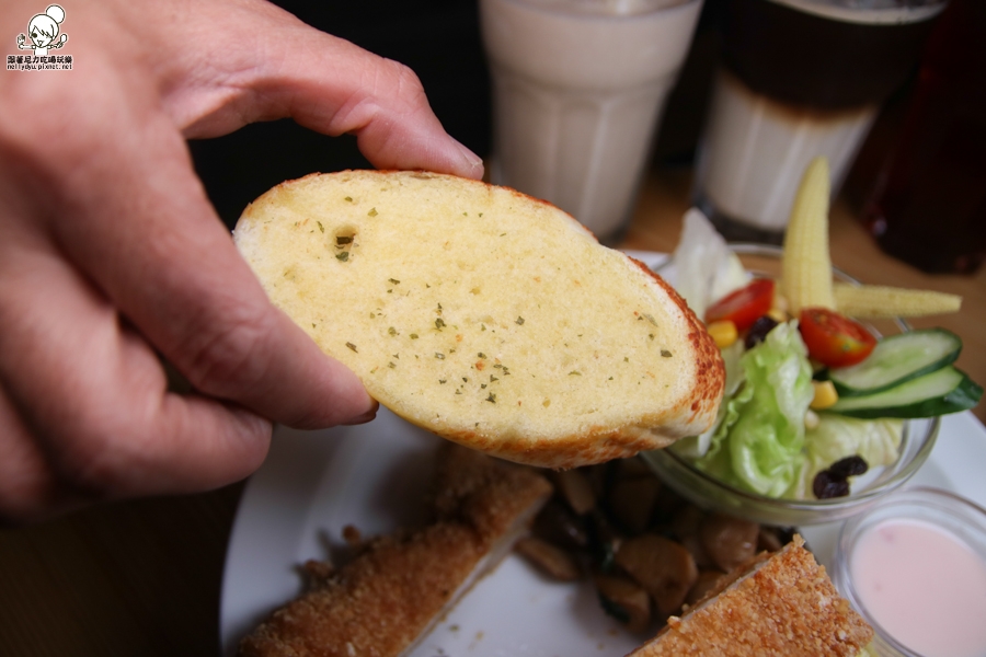 炸豬排套餐還附贈兩片蒜香麵包,份量超實在