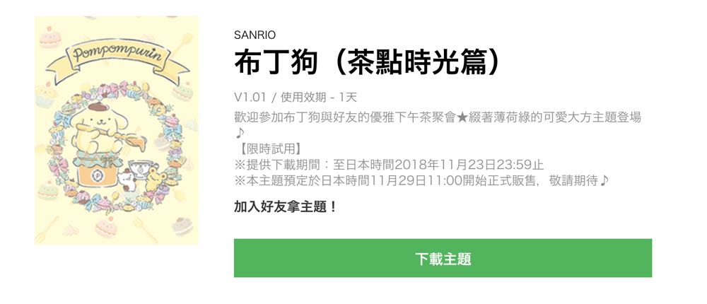 LINE 的限時免費主題又來囉!這次的主角是超級可愛的三麗鷗角色 – 布丁狗,有著圓胖的黃身軀、咖啡色的貝雷帽以及兔唇嘴特色的布丁狗,可是隻超可愛的黃金獵犬。現在 LINE 推出了第 33 款限時免費下載主題- 布丁狗(茶點時光篇),僅有 11 月 23 日一天,下載後擁有一天的使用期限!