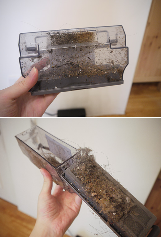 明明三天前才掃拖過………果然有些地方髒污還是很難注意到(汗),這台對毛髮的吸力還不錯,裝上吸力組件的直刷吸口,不會有其他機器人容易遇到的毛髮纏繞糾結問題。
