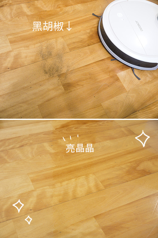 ECOVACS OZMO 900可以電控調節出水量及吸力大小,不用擔心拖完地,地板溼答答不方便,將黑胡椒撒在地上測試看看它的清潔,一秒就乾淨~~超方便!!