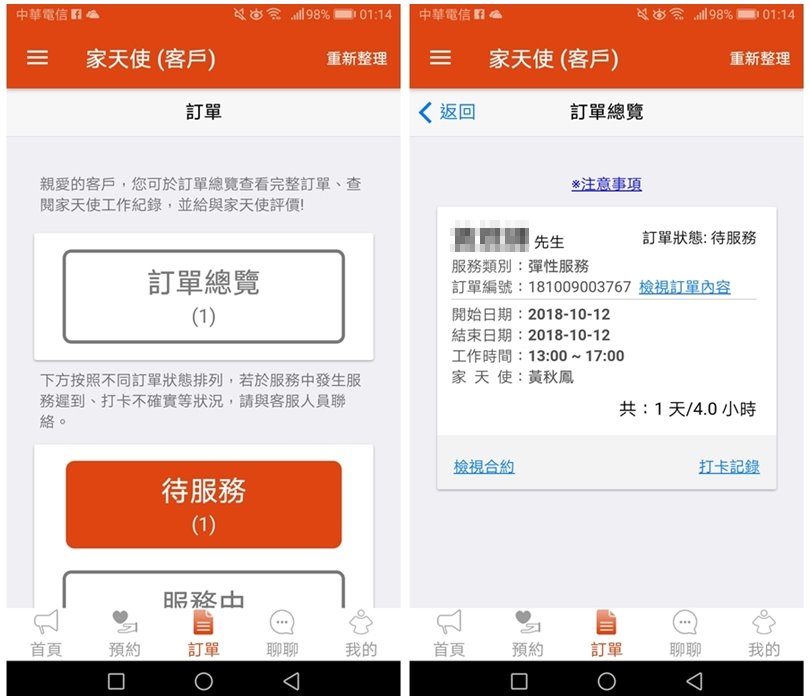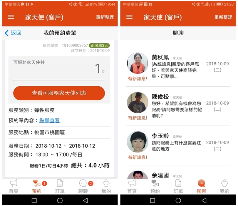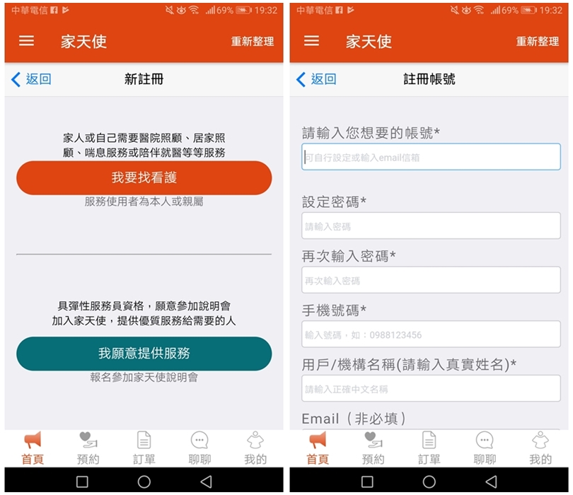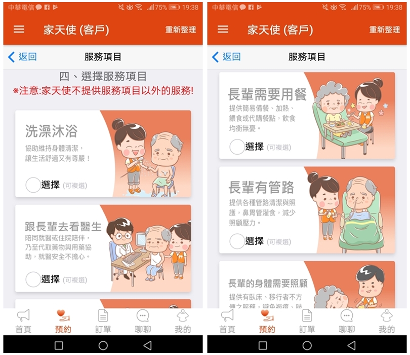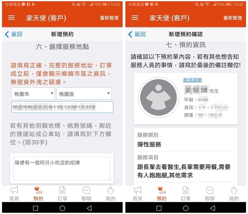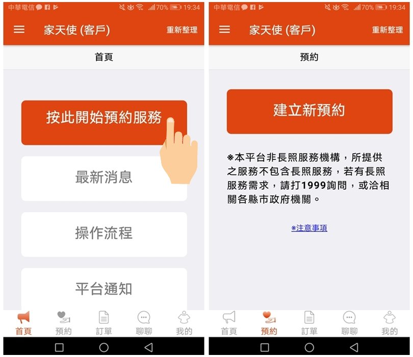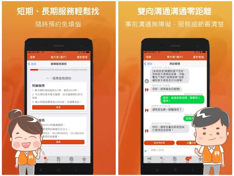 ▼以下簡單介紹一下APP的使用方法吧!「家天使APP」可以提供居家照顧、醫院照顧、短期服務與臨時照護,只要用手機隨時都可以預約,對於家裡有長輩需要臨時照顧、幫忙的朋友來說可說是非常便利!且他們家最特別的地方就是可以跟照護員有雙向溝通的管道,不僅可以事前溝通,在照顧期間有任何問題也可以直接反應,就算雇主不在家也沒問題唷!