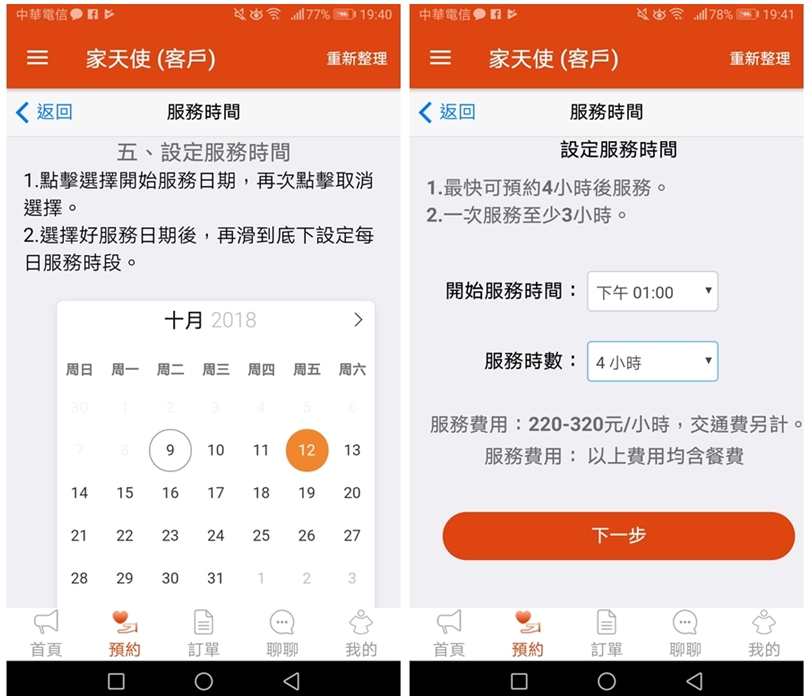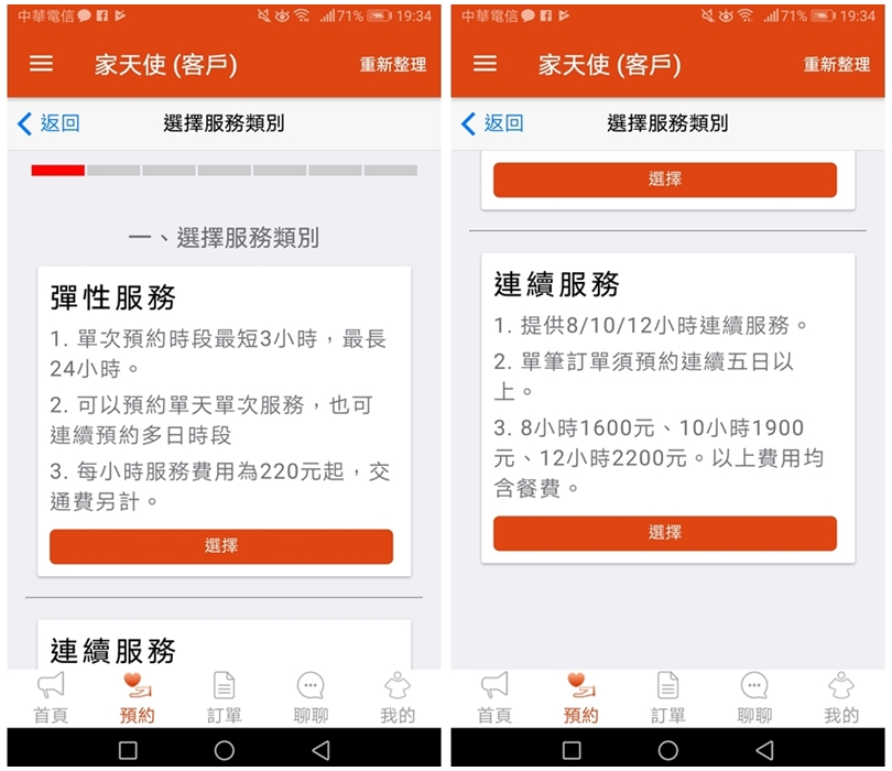 ▼「家天使APP」可以選擇要彈性服務還是要連續服務,彈性服務每次最短3小時,最長24小時,可以預約單天單次也可以預約多日時段,是依小時來計費另加交通費!連續服務則是提供8、10、12小時的服務,需預約連續五日以上,價錢也都相當透明!