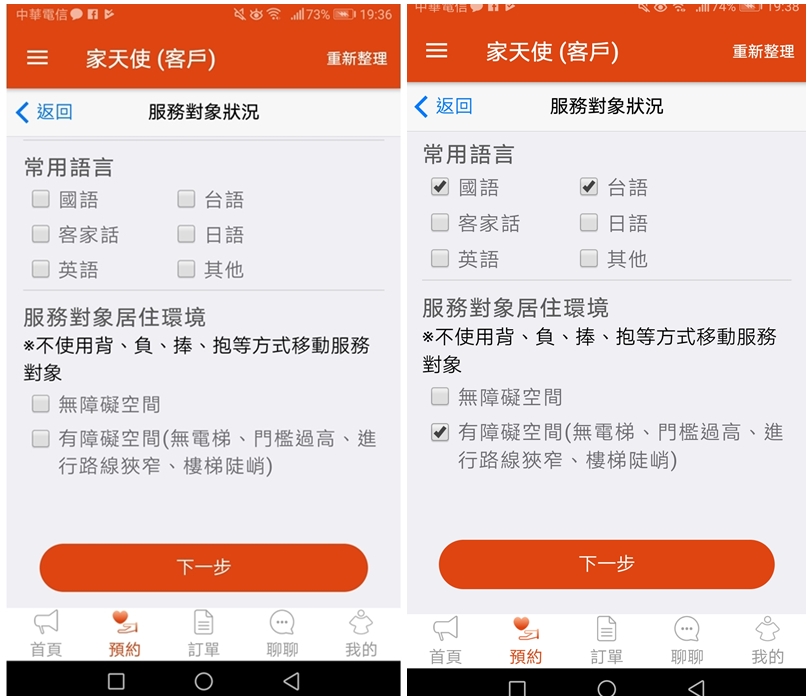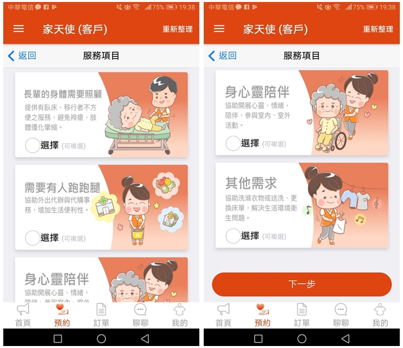 ▼此外也可以照顧身體、跑腿辦事、身心靈陪伴或是其他需求等,選擇好就可以按下一步囉!