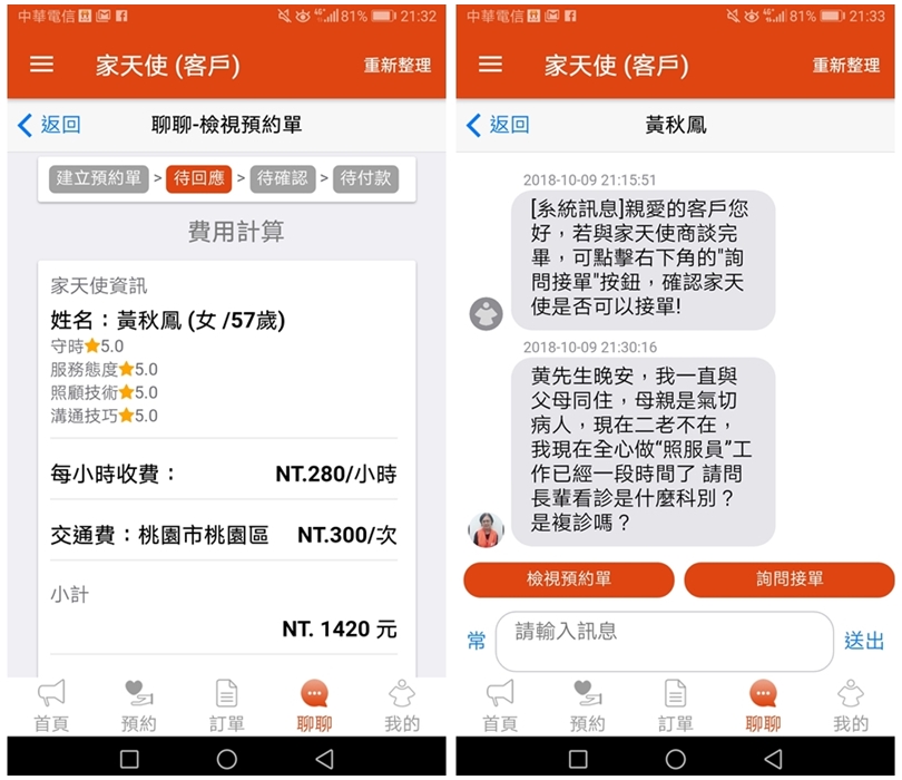 ▼大口剛預約完成就收到有家天使的回應,馬上就有看護應徵啦!若有多位看護應徵,大家可以自行選擇想要的看護來溝通,看哪個比較適合你家長輩!