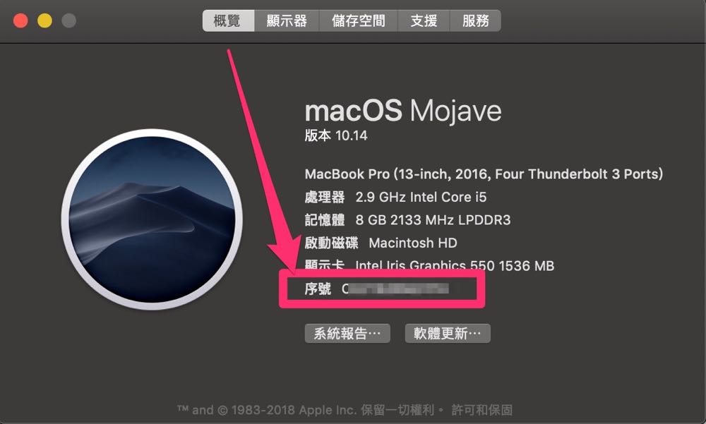 可以從螢幕左上角的「蘋果」選單()選擇「關於這台 Mac」,下方就會有這款筆電的序號。