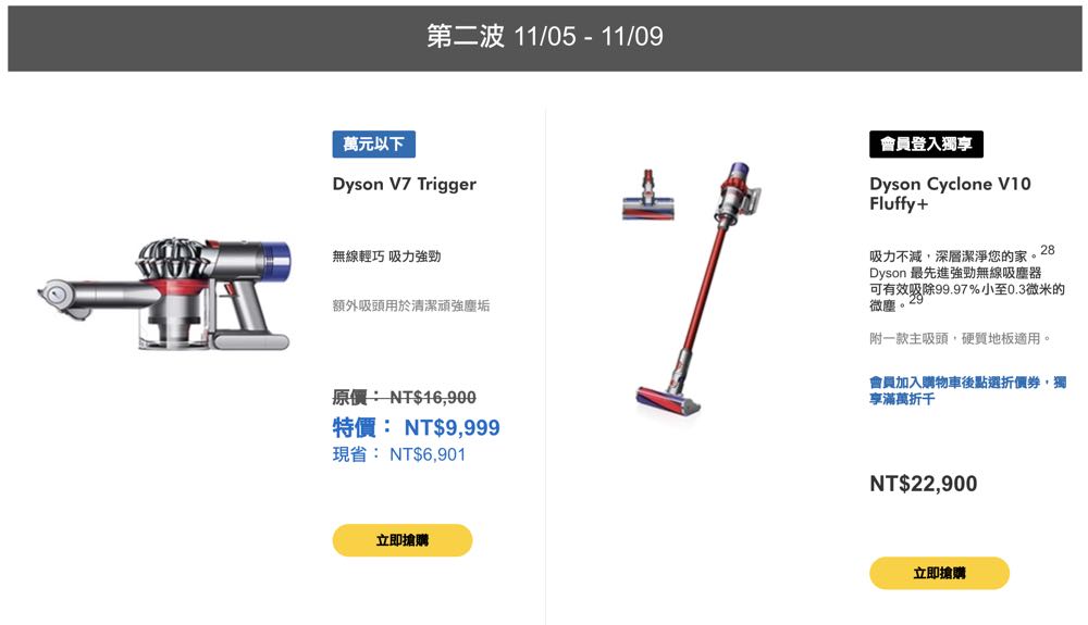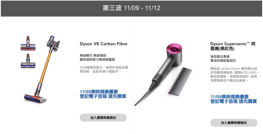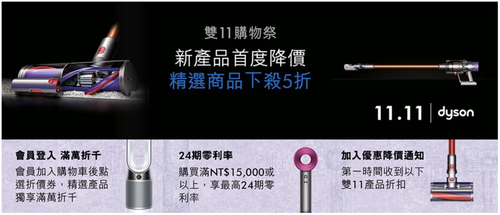 雙 11 即將到來,Dyson 推出超值精選優惠,以「創新科技」為起點提升生活品質,自 11 月 7 日至 12 日推出限時優惠,活動期間前往戴森官方商城享滿萬送五百購物金活動,Dyson V7 trigger 無線除蟎機於 Dyson Online Store 首波開賣只要 $9,999 (原價 $16,900)。Dyson 吹風機禮盒精裝版 (內附 Dyson 限量丹寧包)、Dyson V10 fluffy 及新品 Dyson TP04 在活動期間也祭出會員登錄買萬折千的限時優惠。V8 Carbon Fibre 無線吸塵器也加入第三波 (2018/11/09-12) 歡慶雙 11,不可思議超值入手價,快到 Dyson.tw 搶先登記。