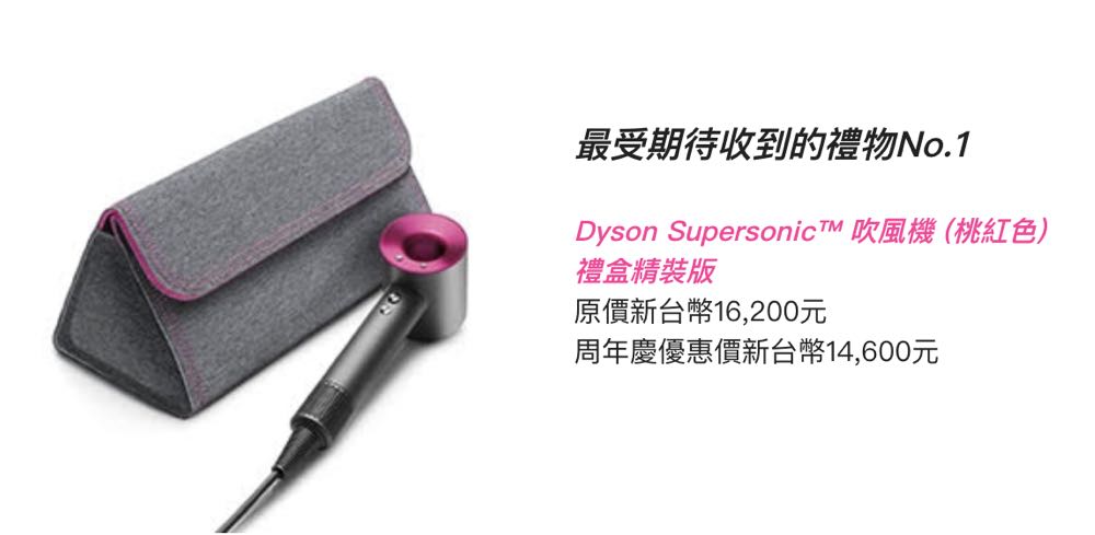 根據調查,超過 5 成以送禮為目的的消費者,會聰明選擇在百貨周年慶時下手。從現在到十二月中,全台各地百貨公司已陸續進入週年慶期間,品牌商也不約而同推出多種優惠,以 Dyson Supersonic 吹風機而言,原價新台幣 16,200 元,周年慶優惠價新台幣 14,600 元,再搭配滿千送百週年慶活動,與各家銀行信用卡的刷卡回饋,送禮心意滿檔又划算!各位男性朋友快快起身,準備規劃送禮採購行程吧!