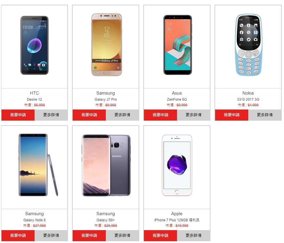 手機的部分品牌選擇也還不少,HTC、SAMSUNG、ASUS、NOKIA等都有,這邊順便附上部分手機規格給大家參考囉~