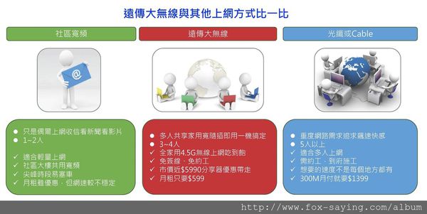 而且申辦該方案最大的好處就是上網不再受限,過去我們使用 ADSL / Cable / 社區網路 全部都會受到空間的限制,今天我只要一離開線路設置的地點,不論它有在高的速度都只能在所在地使用