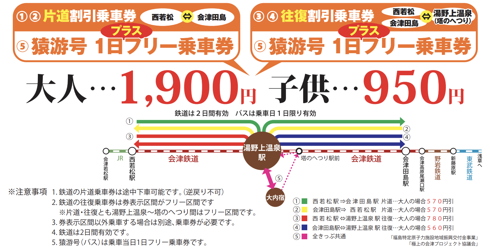 鐵道的部分是2天有效,猿游號是一日券,隨便你搭,可以去大內宿還可以去塔のへつり(塔崖)。