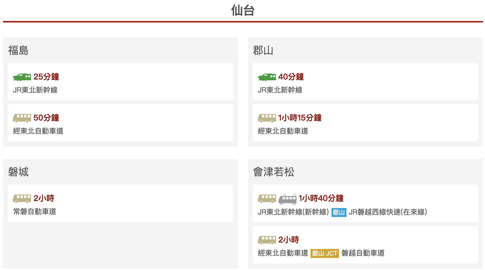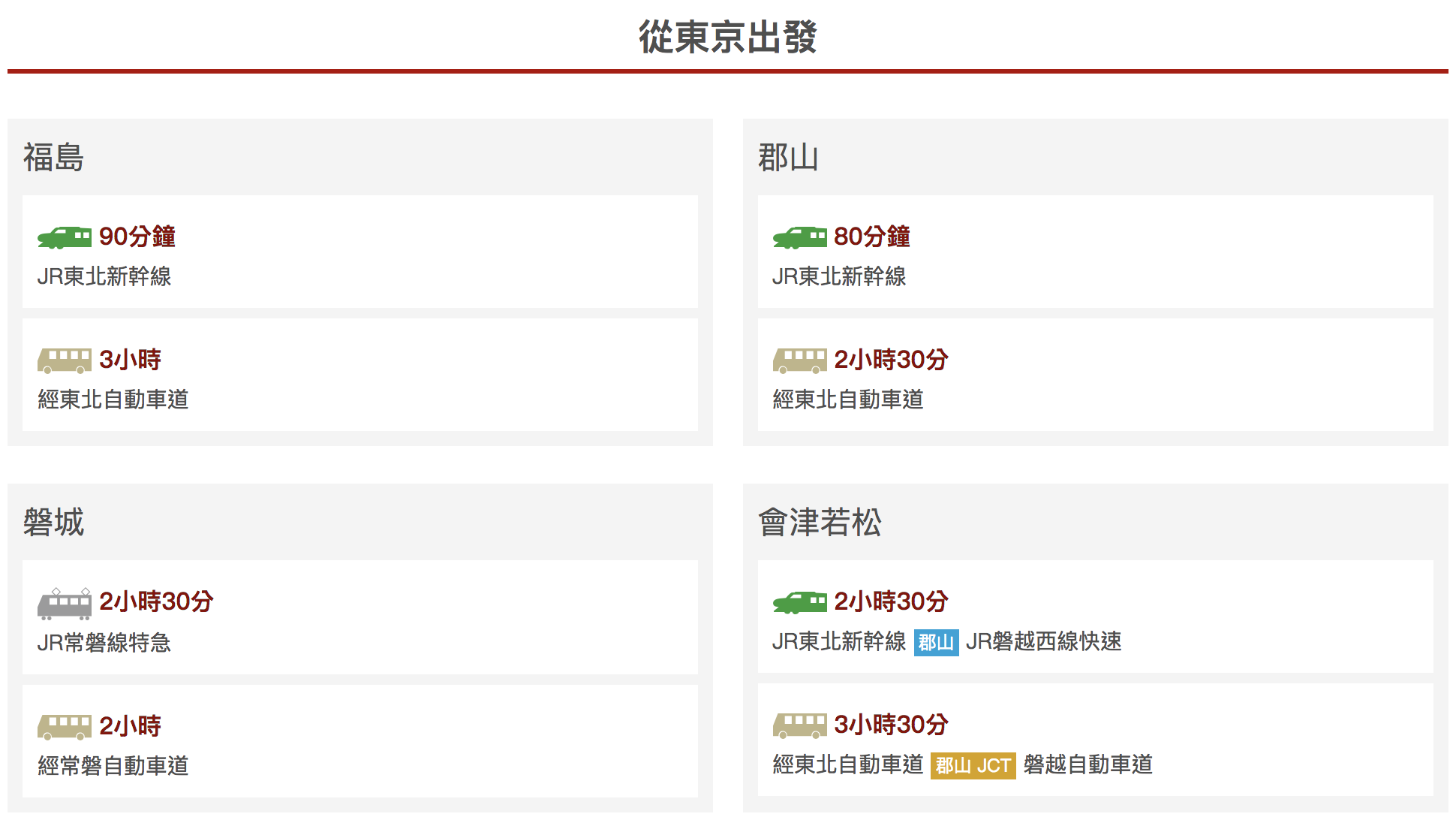 建議可以從東京跟仙台機場搭新幹線去郡山,再從郡山轉車去其他鄉下: