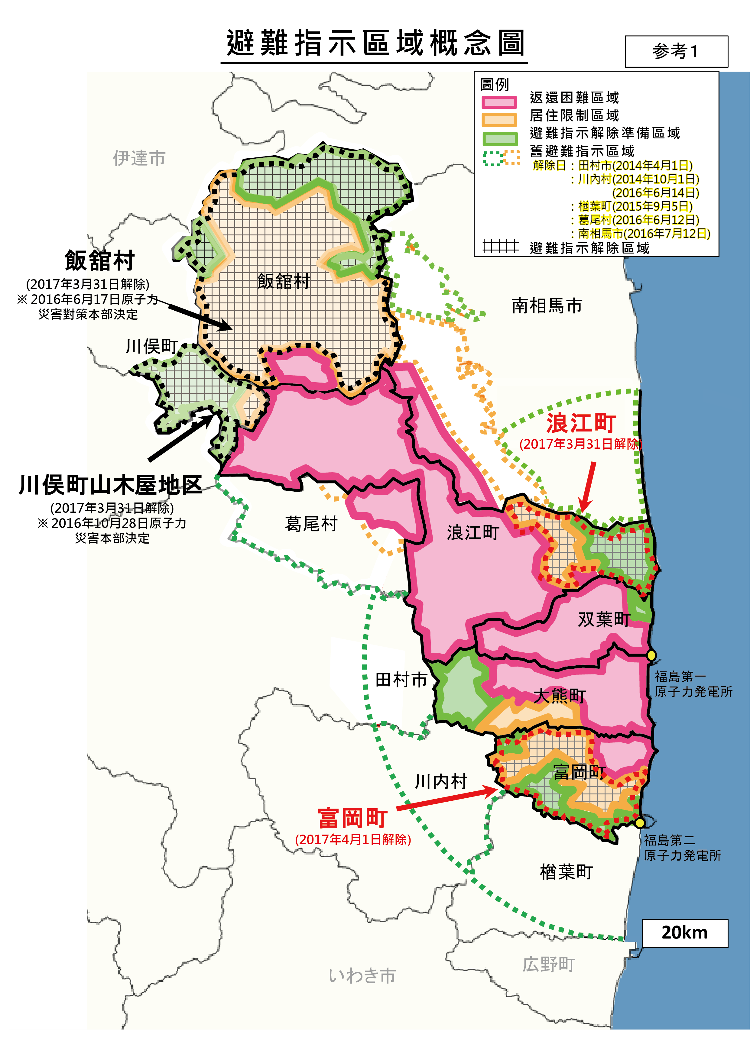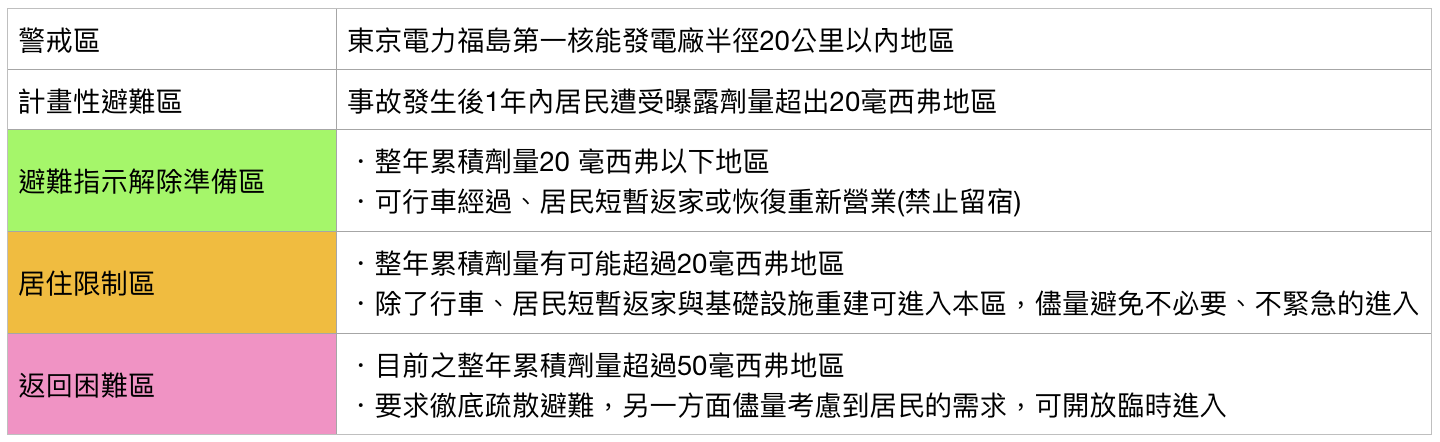 事實上放射物質是有半衰期的,加上福島積極進行去除放射性物質銫的除污作業,現在福島縣居住空間的輻射劑量已相當有限,從上圖也可以看到許多避難區域也隨時間在近幾年慢慢解除。