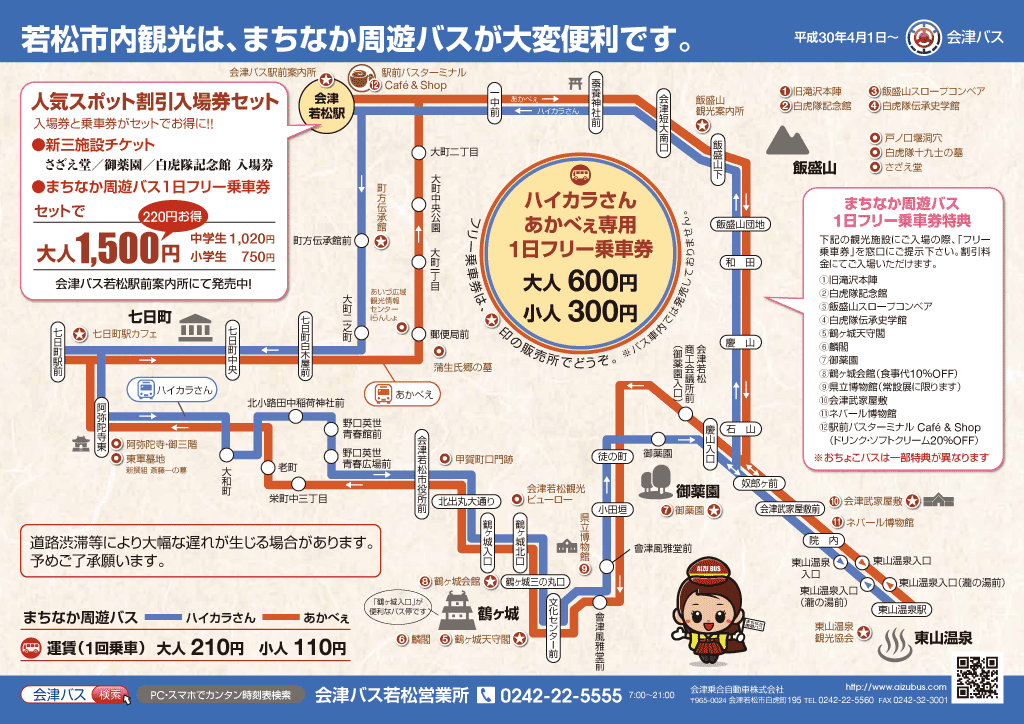 「ハイカラさん」是藍色車逆時針方向搭乘,會先到野口英世廣場、鶴ヶ城等地方,首班車8:00、末班車17:30,每30分鐘一班。