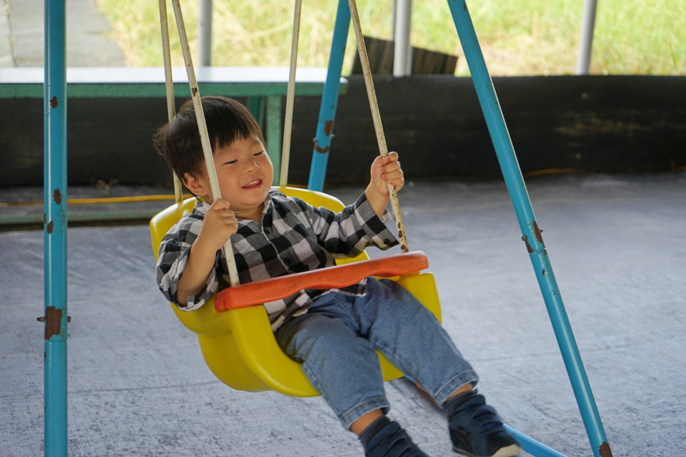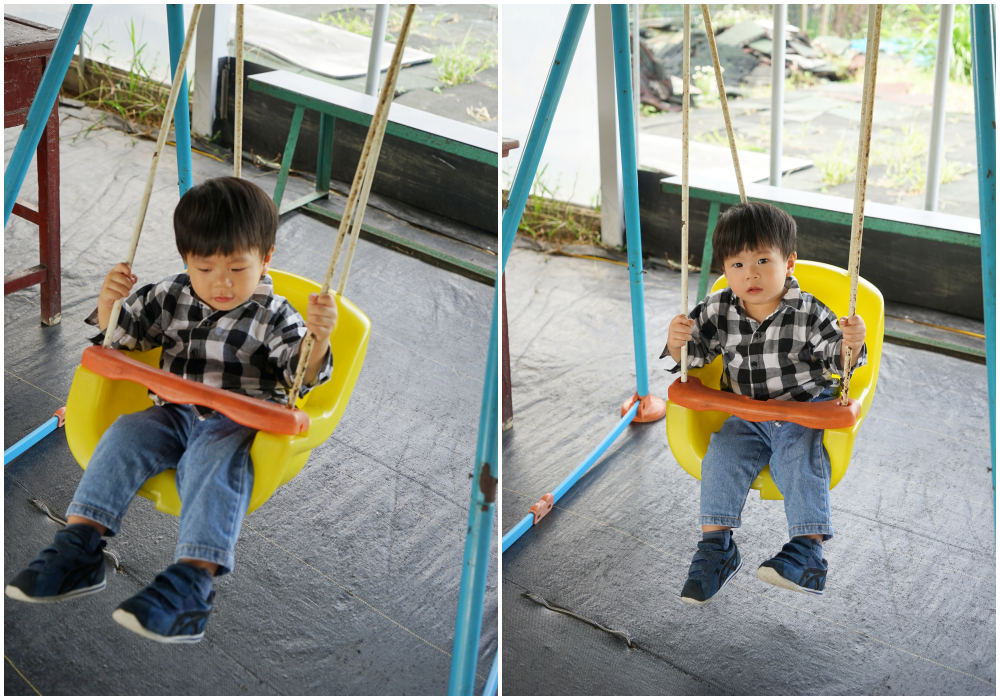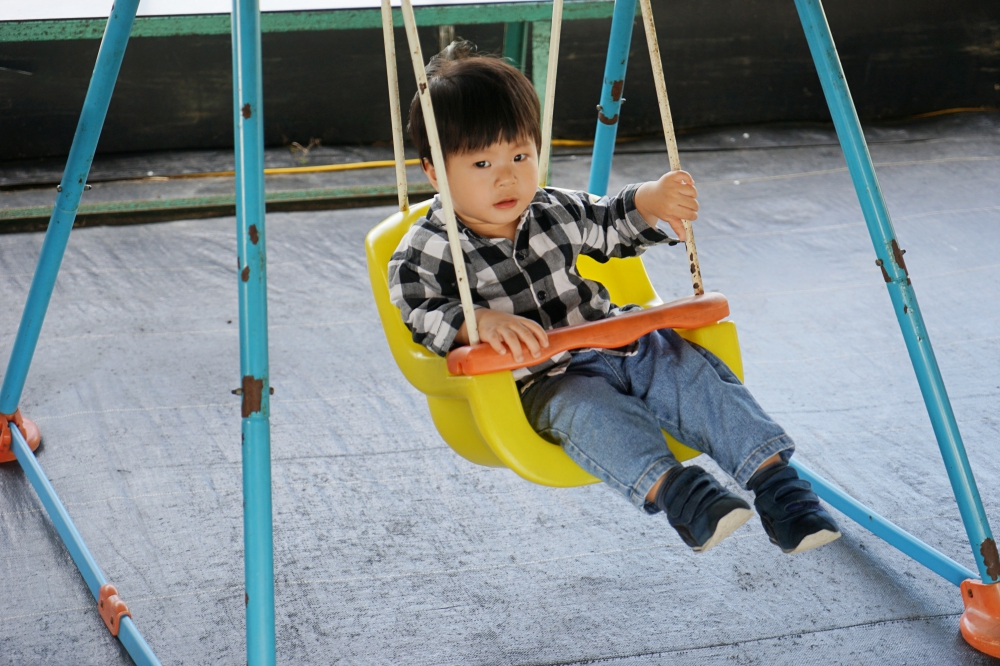 在上面盪了一下子,還蠻知道分寸,自己說要下來。我們就起來去外面玩。
