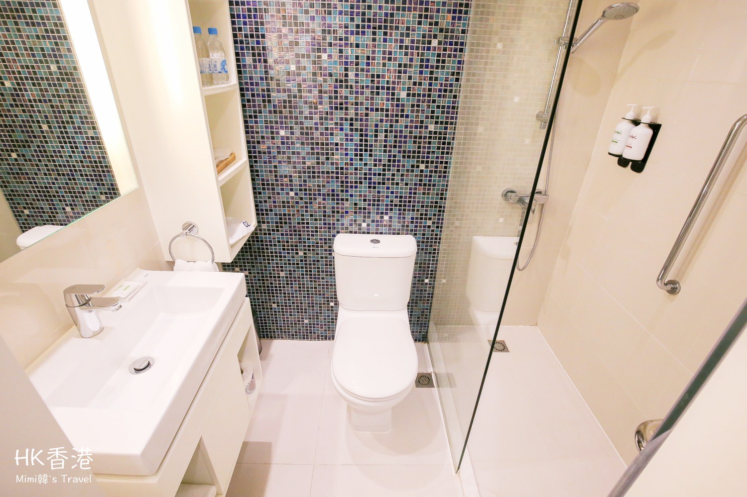 浴室乾濕分離,櫃子中擺著吹風機、牙膏牙刷等盥洗備品,還有兩瓶免費的礦泉水,連續入住每天都會來補充。