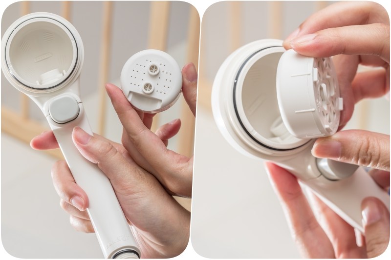 再來,打開舒適蓮蓬頭的出手口上蓋,就可輕鬆地把蓮蓬頭拆成三個部分,也就能解釋第四個優點,可以搭配濾心使用也方便清潔(因為配件就這麼簡單,而且又都能拆)
