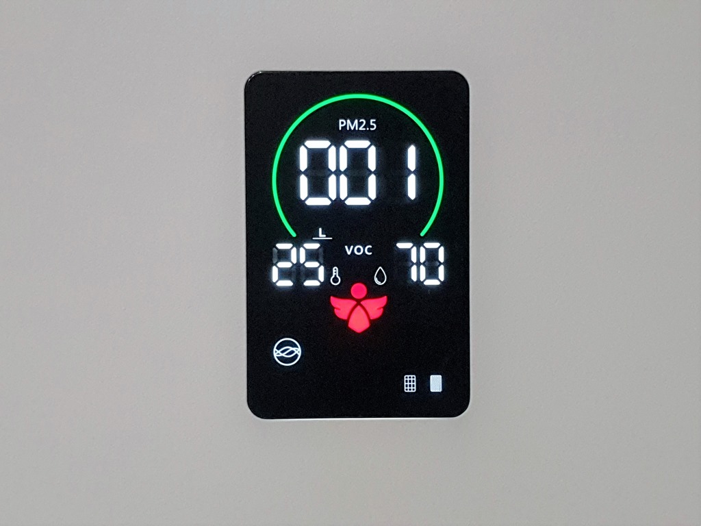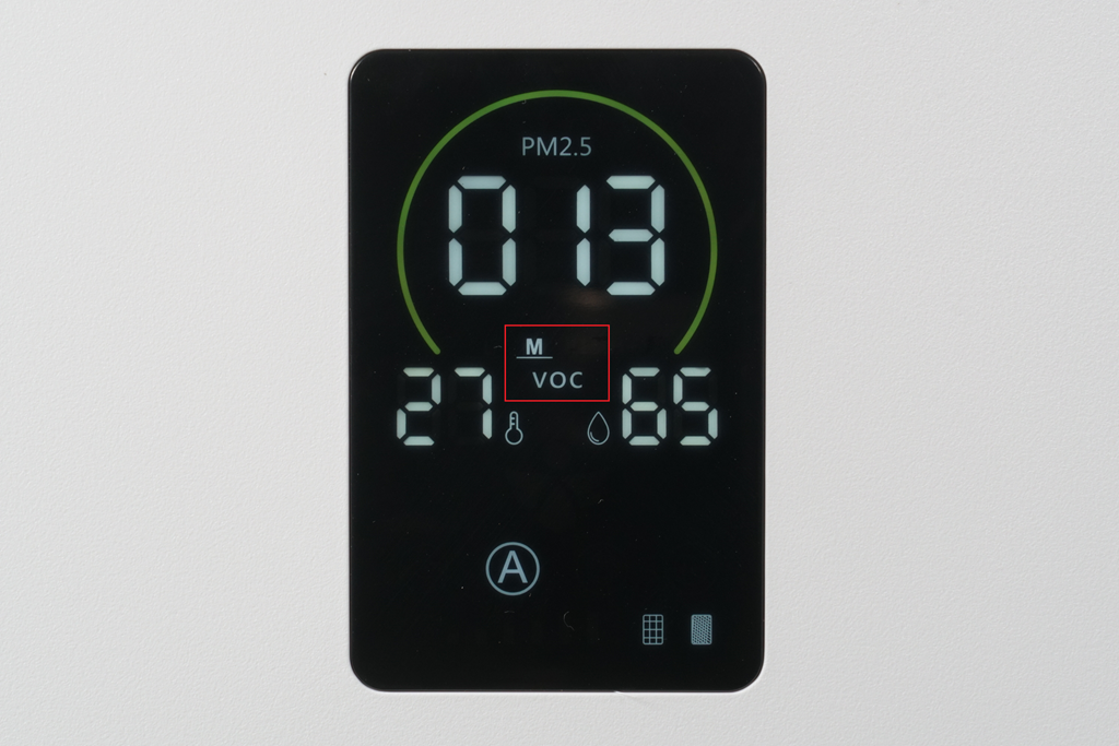 偵測到有害氣體後,風速立刻增強,很快地隨著空氣清淨機的運轉,VOC 數值由 H+ 轉為 H、M 到 L,燈色也由紫色、紅色、黃色轉為綠色。