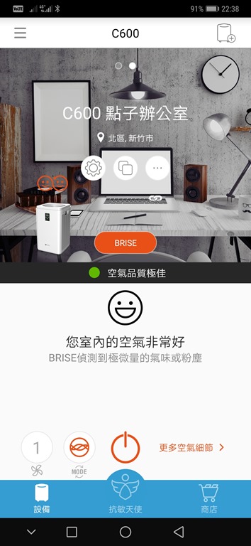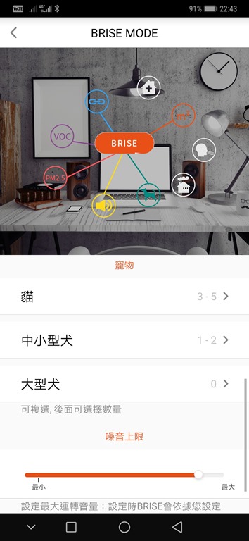 還可以在 APP 中設定更細的場域環境,例如家中有沒有人過敏、是否參考戶外空氣品質、家中寵物數量…等,還能設定能夠忍受的聲音上限,這些都是讓 BRISE C600 聰明自動運作的重要參考,當一切都設定完畢後,把模式切到 BRISE 圖示的 BRISE 模式,你真的就不用理他了。