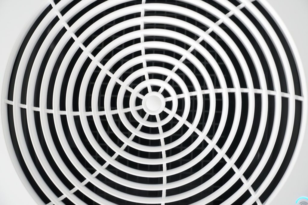 除了實體按鍵外,上方出風口採用凹槽與漩渦出氣設計,可讓乾淨空氣加壓乘氣流渦漩,安靜送到房間更遠的角落。另外出風口還有兩層保護網,可防止異物掉入造成機身傷害。