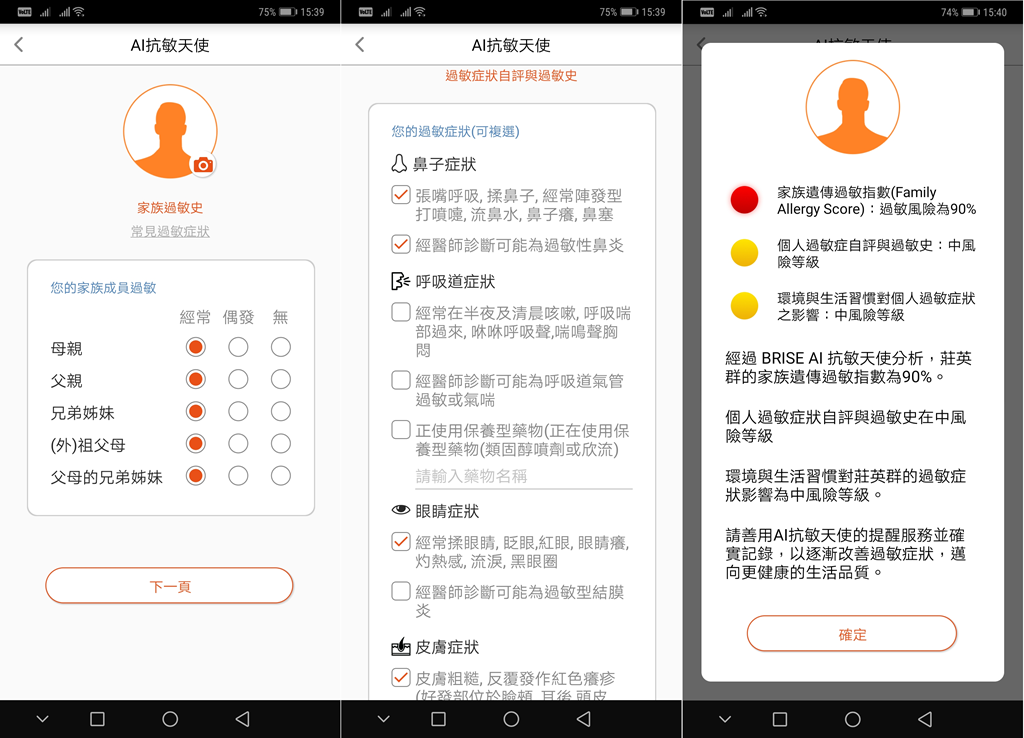 除了一開始設定時會以家族過敏史與經常遇到的過敏症狀評估外,也會不定時根據空氣品質提出問答隨時評估。