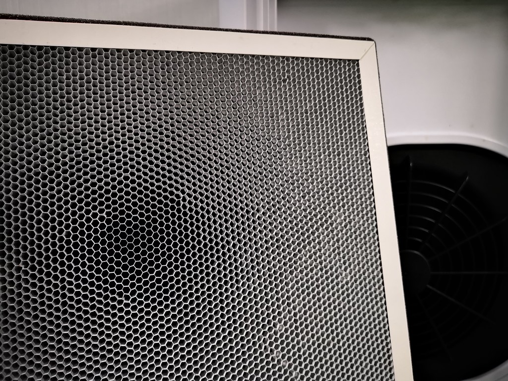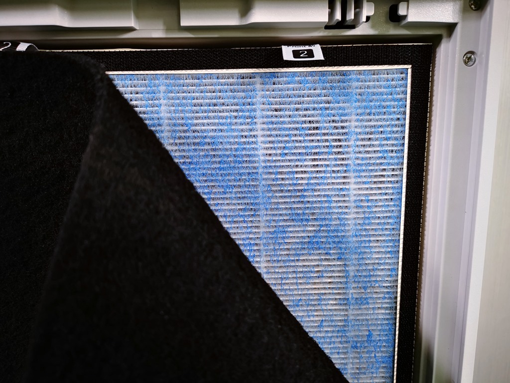 黑色活性碳前置濾網以魔鬼沾黏貼,方便經常更換,在前置濾網下為減緩病菌孳生的抗菌布、有效過濾 99.9% PM2.5 微粒的 HEPA 濾網、過濾甲醛與有害氣體的 VOC 濾網。