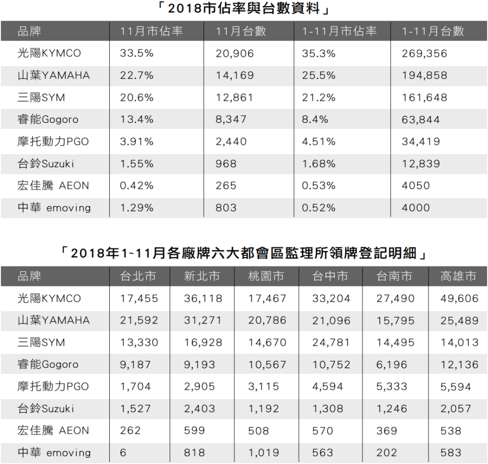 根據交通部數據監理所最新資料顯示,領牌機車數量達763,939台,其中1-11月累計市佔率由KYMCO以35.3 %拔得頭籌,全年度累計銷售量更達269,356台,是機車市場唯一突破26萬台的品牌,穩定邁向國內機車連續19年銷售總冠軍。有鑑於11月為機車傳統淡季,以及在大選消費觀望衝擊下,各品牌機車銷售量皆下滑,KYMCO仍以20,906台銷售量一枝獨秀,佔國內機車市場近八成的100cc/125cc級距,KYMCO 125cc市佔率達40.4%、100cc達37.8%,一舉奪下雙冠, KYMCO GP 125更以80,751台遙遙領先各廠,成為全台最暢銷的125cc速克達,顯見優質環保六期排放的GP125非常受大家歡迎。