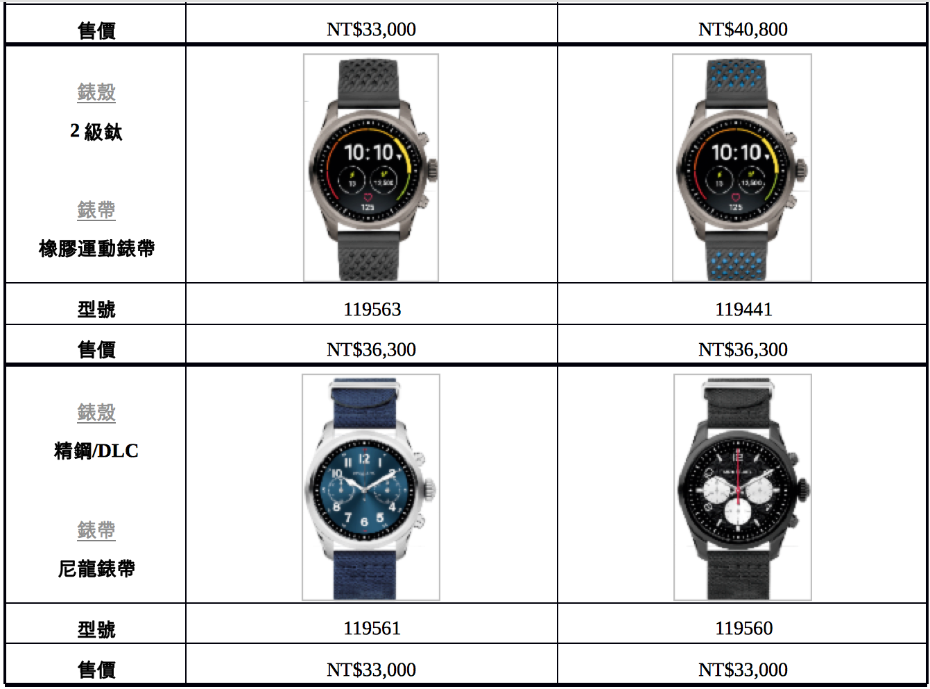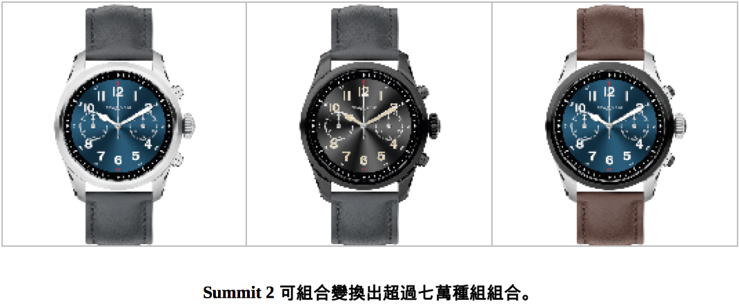 Summit 2智能腕錶配有四種錶殼材質:黑色類鑽碳精鋼錶殼(DLC)、精鋼錶殼、雙色精鋼錶殼與鈦錶殼(Titanium),並且可搭配11種可互換式錶帶選擇,如:小牛皮錶帶、米蘭精鋼帶、橡膠運動款錶帶與尼龍錶帶,內建超過一千種錶面組合,可自行選擇顯示器、背景、指針與複雜功能,一共可創造出七萬種以上的外觀組合,根據穿搭及心情驚喜變換。