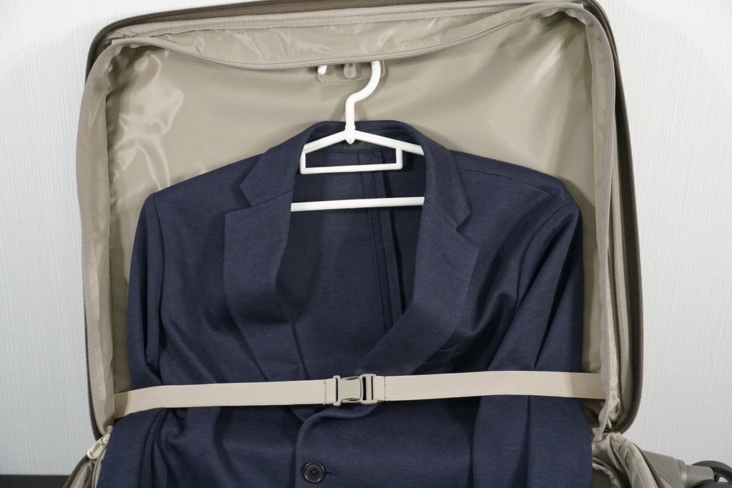 這專屬正裝套裝防皺隔層中,有衣架固定掛勾、衣物固定橫桿與較長衣物固定夾板,固定位置的衣物,不會因為行李搬運的晃動而擠壓產生皺摺,隔層空間與主要收納行李的空間是分開的,也不會受到主空間行李的擠壓晃動,所以可以讓皺摺程度降到最低。