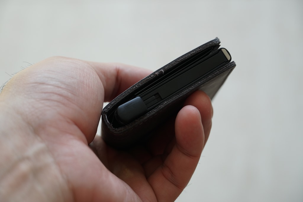 除了特殊設計的鋁合金卡片夾外,還以牛皮皮革包覆,手上這款為無鈕扣手工縫製洗舊復古設計,其他還有具有鈕扣或是平滑皮革款式可選擇。皮革設計中還包還兩個小卡片夾,可放入幾張名片備用,另外還有紙鈔收納夾,隨身帶著實體貨幣,以免遇到無法以信用卡支付的店家,而無法付款。
