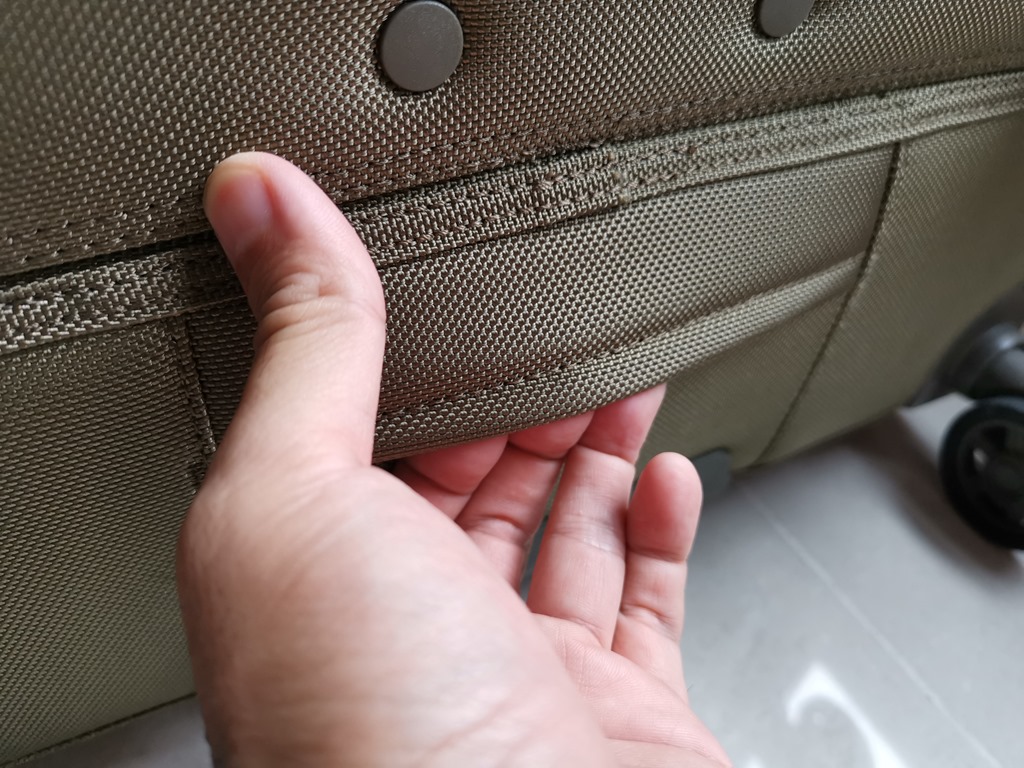 柏萊立 25 吋商務行李箱推出三種顏色,有海軍藍、黑色與我手中的這款卡其綠,除了有著抗磨損、防撥水、防污的 1680D 防彈尼龍材質,在側面的布面提把、上方的皮質提把,都添增了行李箱的方便與質感。還有底部一體成形的握把,可方便搭配上方握把將行李抬放到高處,這對登機箱款式尤其重要。
